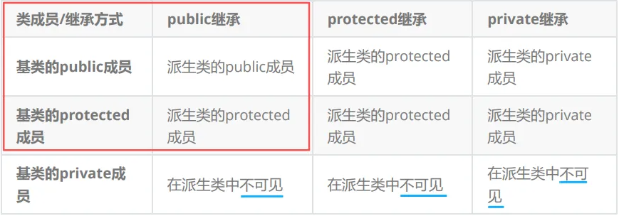 - 如果基类成员不想在类外直接被访问,但需要在 派生类中能访问,就把基类成员定义为protected