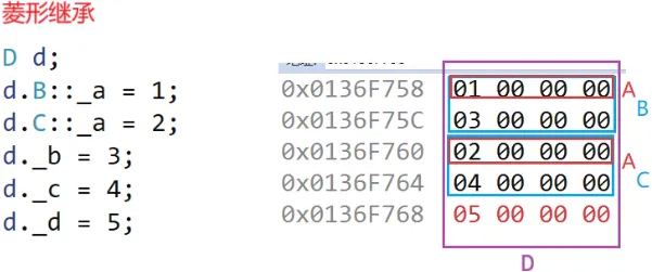 菱形继承的问题:数据冗余**(浪费空间)、** 二义性**(不知道要访问谁)**