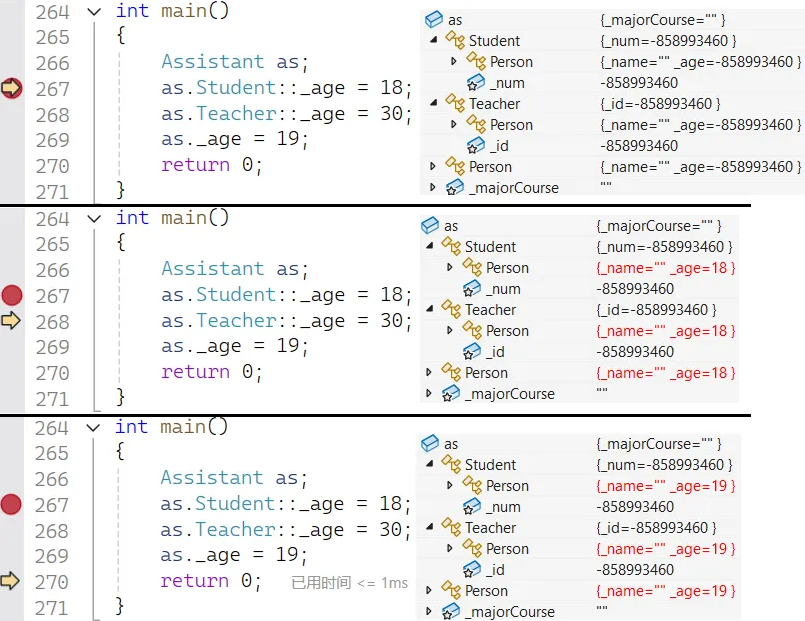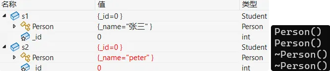 - 不可见:基类的私有成员还是被继承到了派生类对象中,但是语法上限制派生类对象不管在类里面还是类外面,都不能去访问它。基类的私有成员在基类中还是能用,在基类外不能用