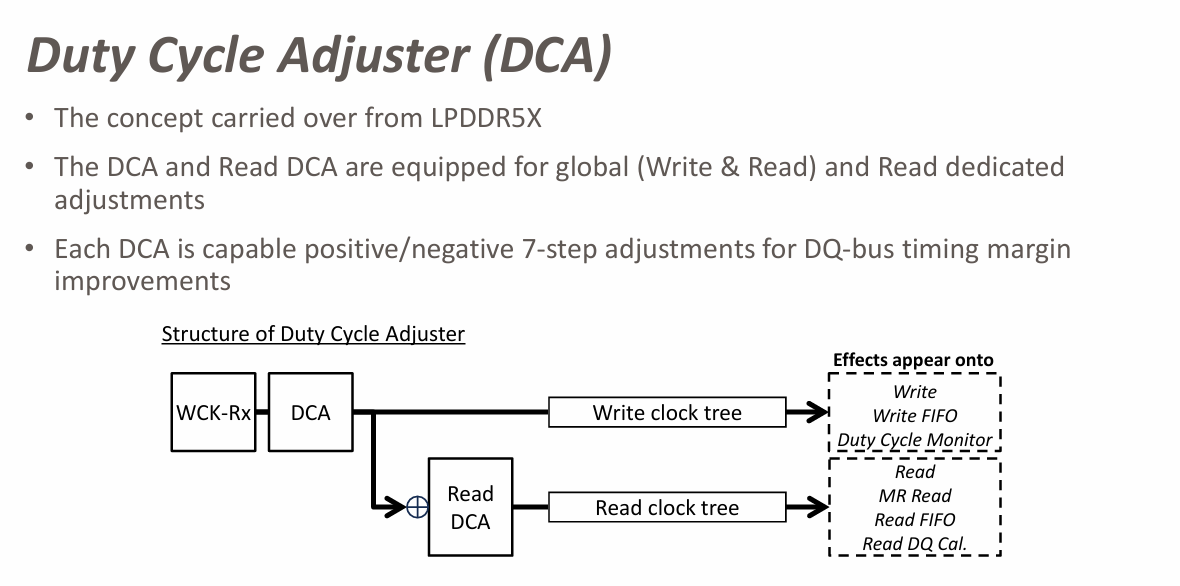 DCA在LPDDR5就被使用用于调整Read场景下信号的Delay,这里的设计,包括7 Steps的调整幅度都是和LPDDR5一致的。