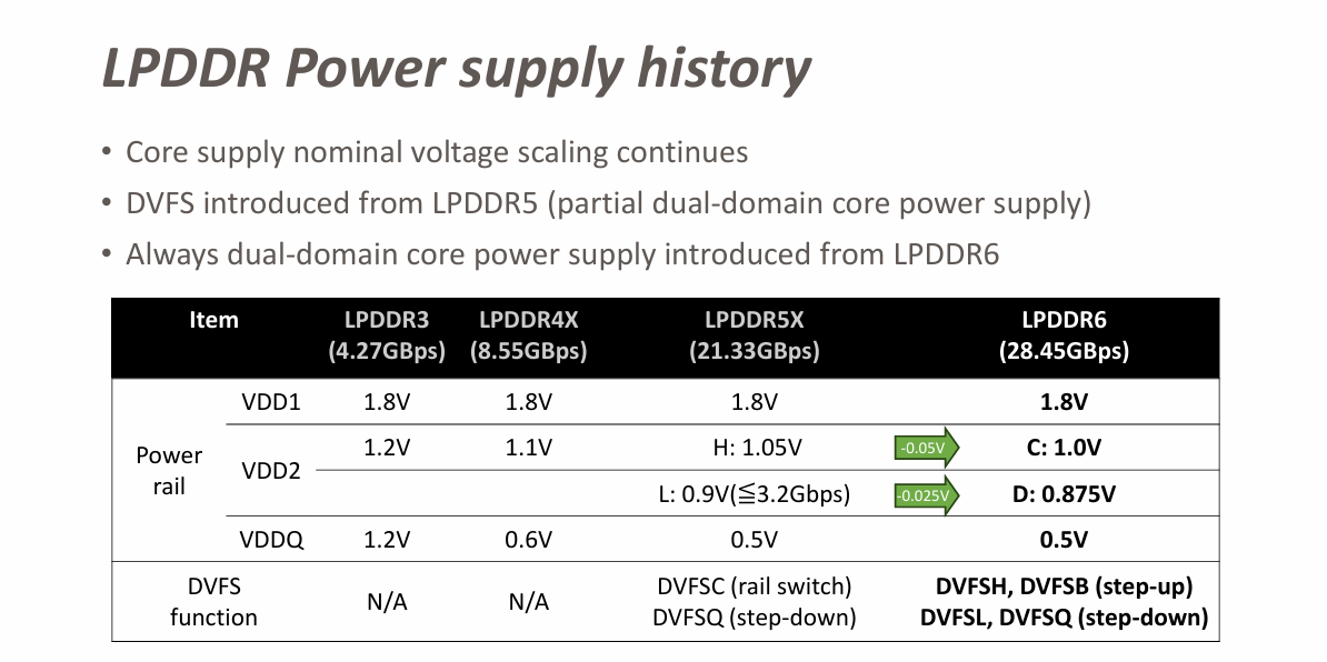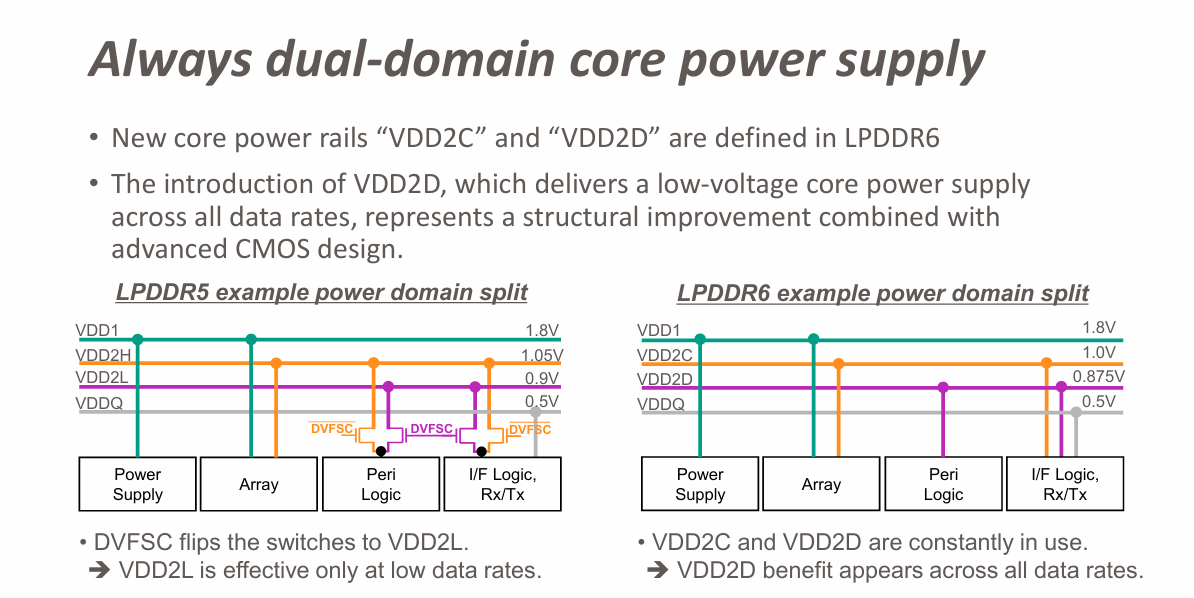 不像LPDDR5因为VDD2L只能适用于低频,需要通过DVFSC切换VDD2L。LPDDR6的VDD2C和VDD2D在所有频率下都可以一直使用。