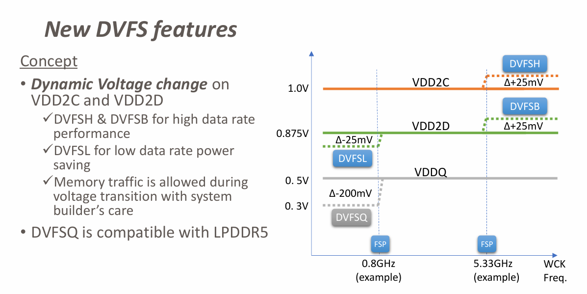从上图可以看到,DVFS的技术变化就是围绕VDD2的Power Rail变化展开的,VDDQ本身的DVFSQ相比LPDDR5并没有变化。