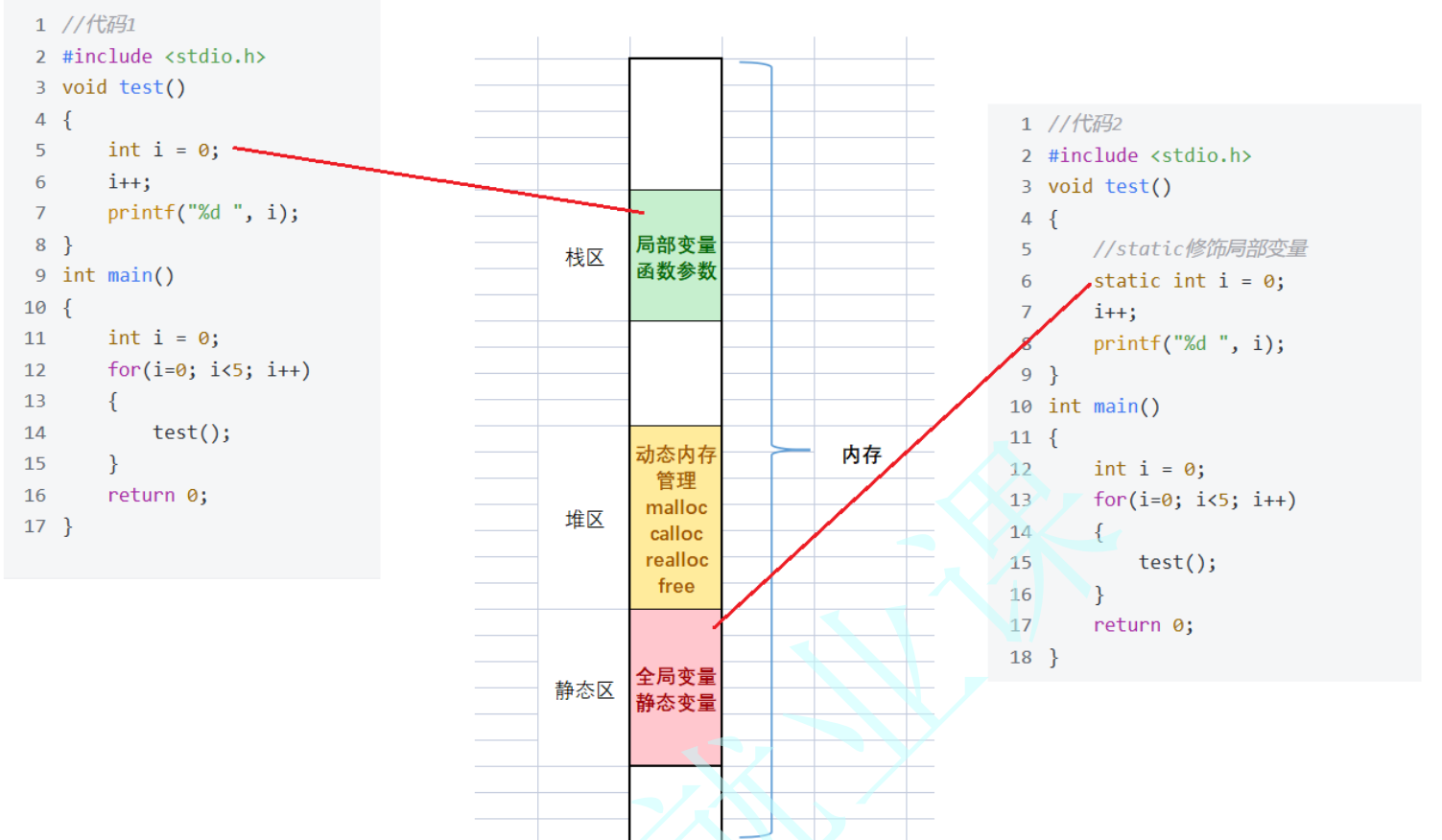 代码1的test函数中的局部变量i是每次进⼊test函数先创建变量(⽣命周期开始)并赋值为0,然后++,再打印,出函数的时候变量⽣命周期将要结束(释放内存)。