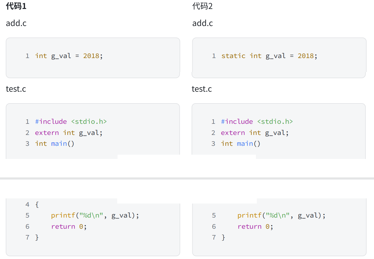 extern是用来声明外部符号的 ,如果⼀个全局的符号在A文件中定义的,在B文件中想使用,就可以使用 extern 进行声明,然后使用。代码1正常,代码2在编译的时候会出现链接性错误。