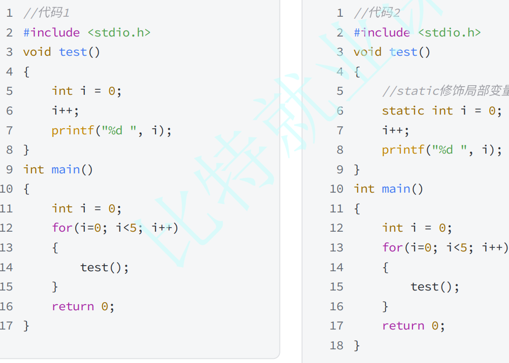 对比代码1和代码2的效果,理解 static 修饰局部变量的意义。