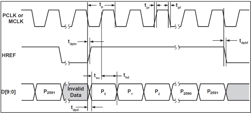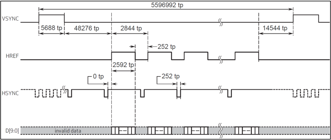 从上图可以看出,图像数据在 HREF 为高的时候输出,当 HREF 变高后,每一个 PCLK 时钟,输出一个 8 位/10 位数据。采用 8 位接口,所以每个 PCLK 输出 1 个字节,且在RGB/YUV 输出格式下,每个 tp=2 个 Tpclk,如果是 Raw 格式,则一个 tp=1 个 Tpclk。比如采用 QSXGA 时序, RGB565 格式输出,每 2 个字节组成一个像素的颜色(低字节在前,高字节在后),这样每行输出总共有 2592*2 个 PCLK 周期,输出 2592*2 个字节。