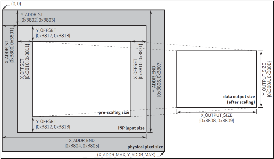 该设置允许用户在 ISP 输入窗口的基础上,再次设置将要用于缩放的窗口大小。该设置仅在 ISP 输入窗口内进行 x/y 方向的偏移(X_OFFSET/Y_OFFSET)。通过: 0X3810~0X3813 等 4个寄存器进行设置。
