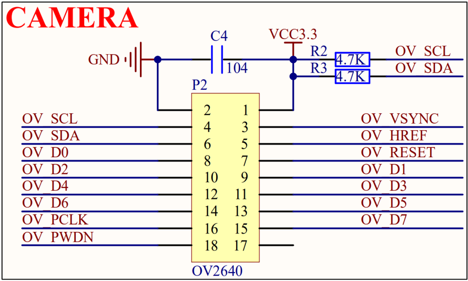 LCD_CAM控制块CAMERA模块则用于接收并行视频数据信号,支持DVP8-/16-bit模式。ESP32S3开发板板载了一个摄像头接口(P2),该接口可以用来连接原子OV5640/OV2640/OV7725等摄像头模块。本章将使用ESP32-S3驱动原子OV2640摄像头模块,实现摄像头功能。
