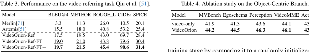 实验结果表明,无论是零样本(zero-shot)设置还是经过微调,VideoOrion在视频指代任务上的表现都远超此前的专用模型Artemis和Merlin,这说明物体Token确实能让模型精准地"理解"我们到底在问哪个物体。