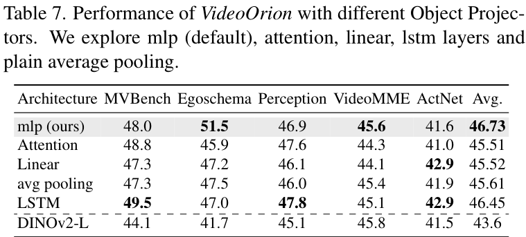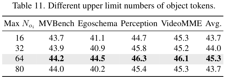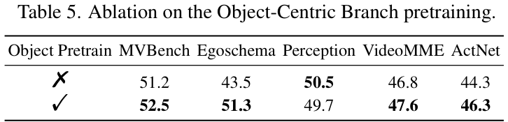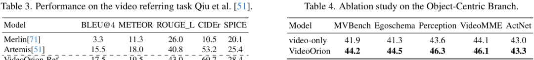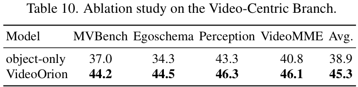 上表对比了仅使用视频分支(video-only)和完整VideoOrion模型的性能。结果很明显,加入了物体为中心分支后,模型在所有测试集上的性能都有了一致的提升。