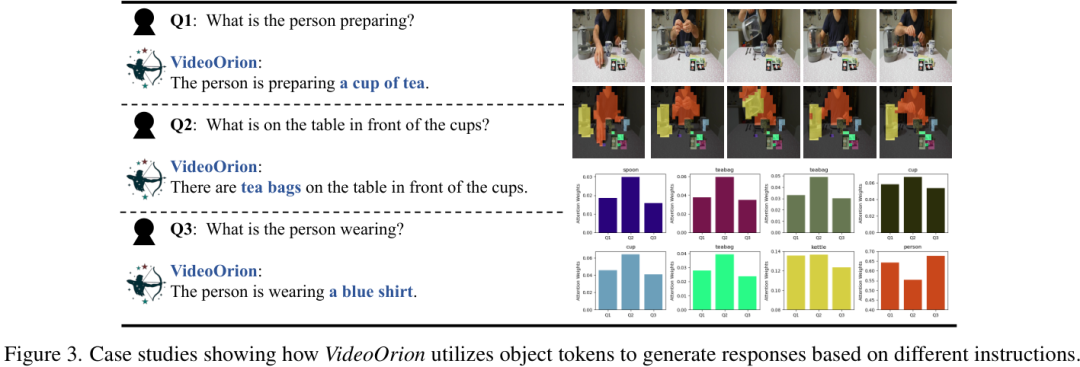 上图展示了当被问到不同问题时,VideoOrion如何动态地调整对不同物体Token的注意力。当问题是"这个人在干什么?"时,模型会更关注"人"这个物体。当问题是"杯子前面是什么?"时,模型则会把注意力更多地放在"茶包"和"杯子"上。这种动态的注意力分配机制,让VideoOrion能够根据指令灵活地聚焦于最相关的信息。