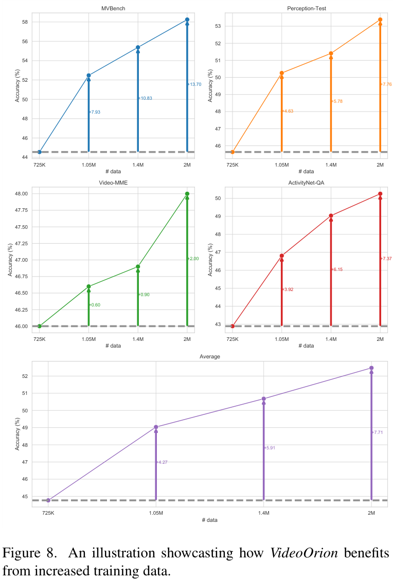 一个令人振奋的发现是,随着训练数据的增加,VideoOrion的性能能够持续稳定地提升,这展示了它巨大的潜力。