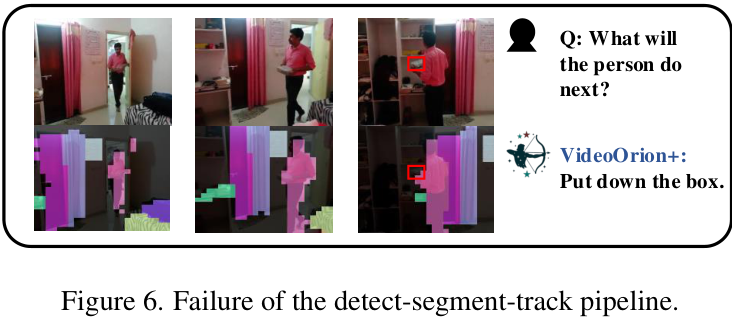 例如,物体追踪流水线的性能直接影响最终效果。如果视频质量不高,或者物体检测、追踪失败了,模型的理解就会出错。上图就展示了一个追踪失败的例子。