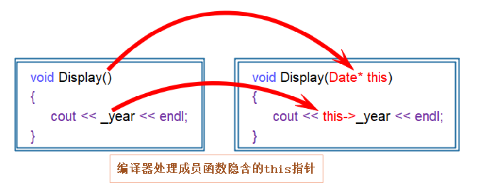 的指针参数,让该指针指向当前对象(函数运行时调用该函数的对象),在函数体中所有"成员变量"