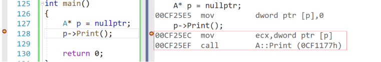 选C,因为p调用Print,不会发生解引用,因为Print的地址不在对象中,p会作为实参传递给this指针,this指针虽然是空的,但是没有对this指针解引用