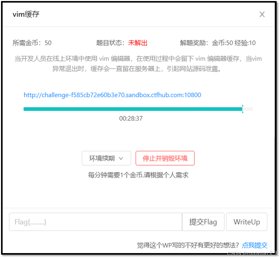 结尾的临时交换文件进行渗透测试。点击打开题目,此时系统自动创建Docker环境,下图蓝色部分的URL地址就是靶场环境。