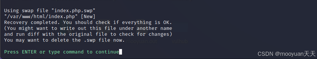 进行恢复,vim会自动解析交换文件并还原出原始文件内容。执行Vim 恢复 index.php.swp(交换文件)命令时系统输出的提示,核心含义是 "交换文件恢复完成,需确认内容并处理残留文件"。提示如下所示。