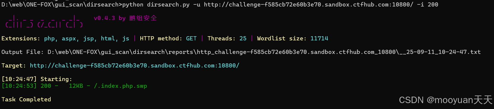 python dirsearch.py -u http://challenge-f585cb72e60b3e70.sandbox.ctfhub.com:10800/ -i 200