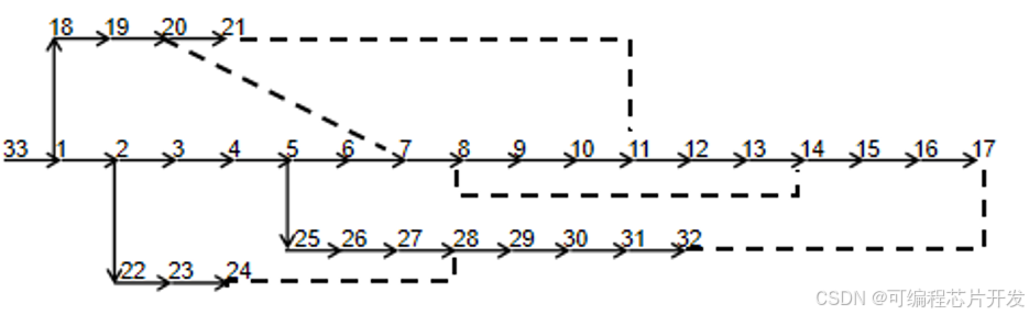 以IEEE33节点系统为研究对象,通过YALMIP建模、CPLEX求解混合整数二阶锥规划(MISOCP)问题,实现多时段(24 小时)配电网重构。核心目标是在满足辐射状拓扑、电压约束、功率平衡等条件下,最小化全时段网络损耗。