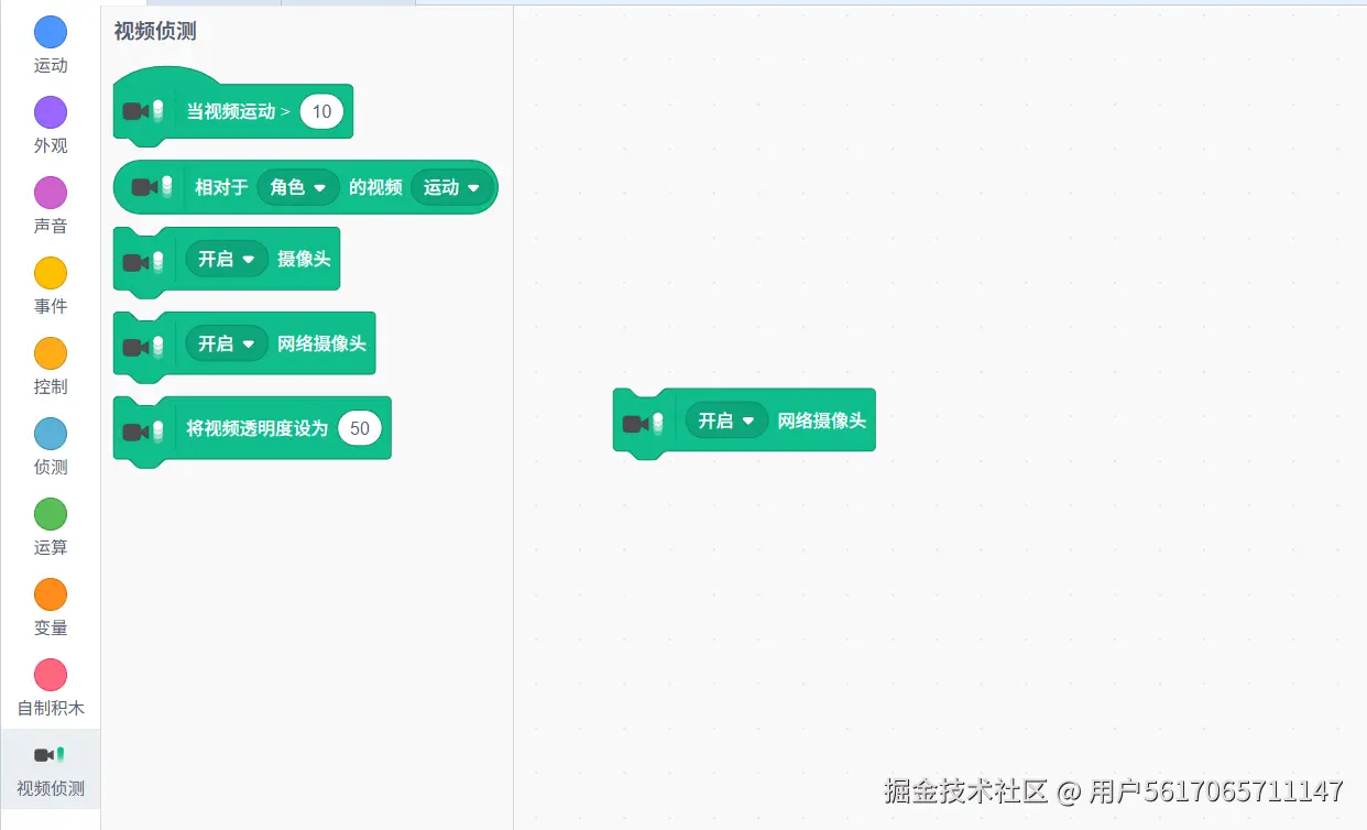 好了,完成以上操作,我们就大功告成了,运行起来软件,导入视频侦测的扩展后就会发现多了一个块