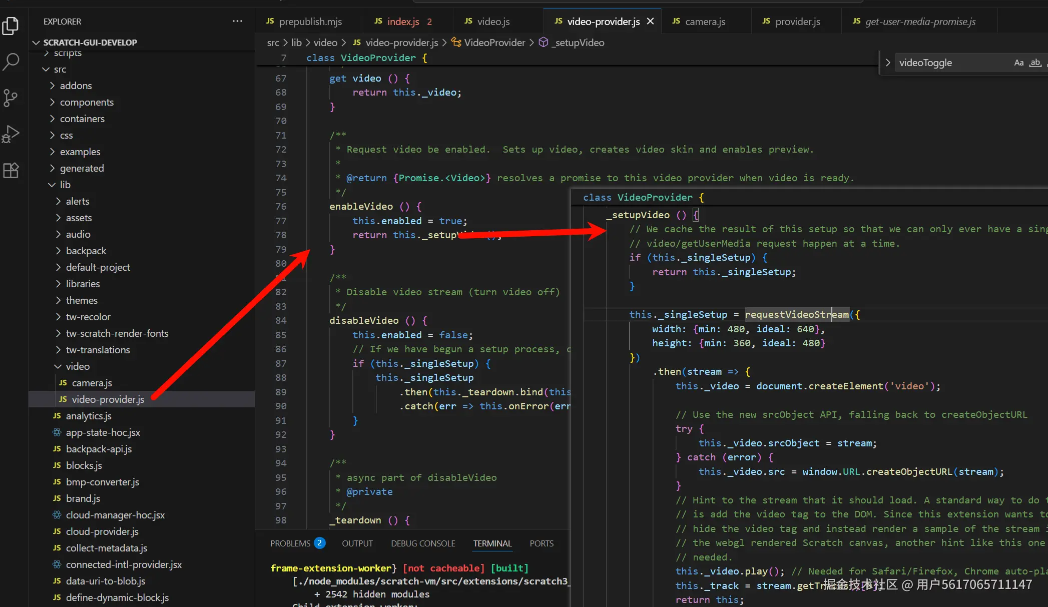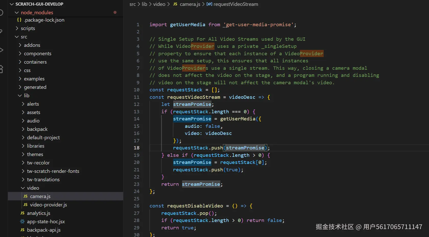 如果你也跟着我找到了这里,恭喜你,你已经了解了,scratch舞台区开启摄像头的流程,其实我们还可以继续往下找,可以看到又进入了当前目录下的camera.js目录,这里直接调用了getUserMedia用来开启摄像头。