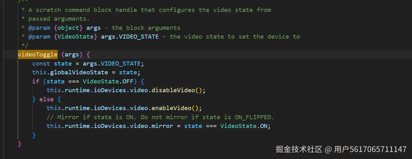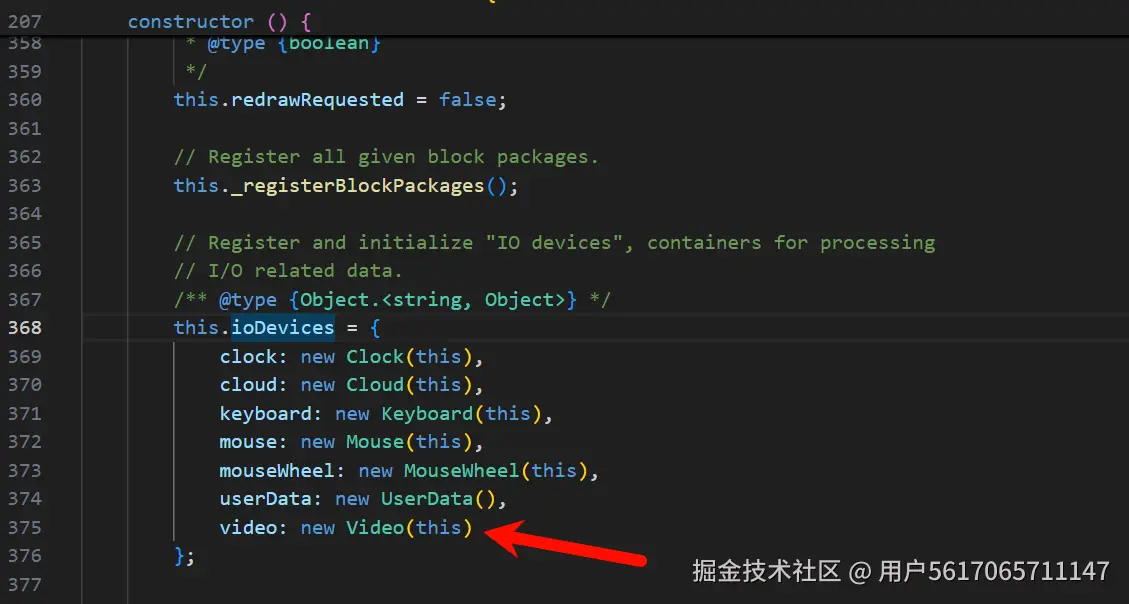 大家按照我的步骤可以很容易的找到开启摄像头这个块的执行逻辑,很显然这里调用了this.runtime.ioDevices.video这个的两个方法用来开启和关闭摄像头我们直接进入ioDevices后可以看到以下代码: