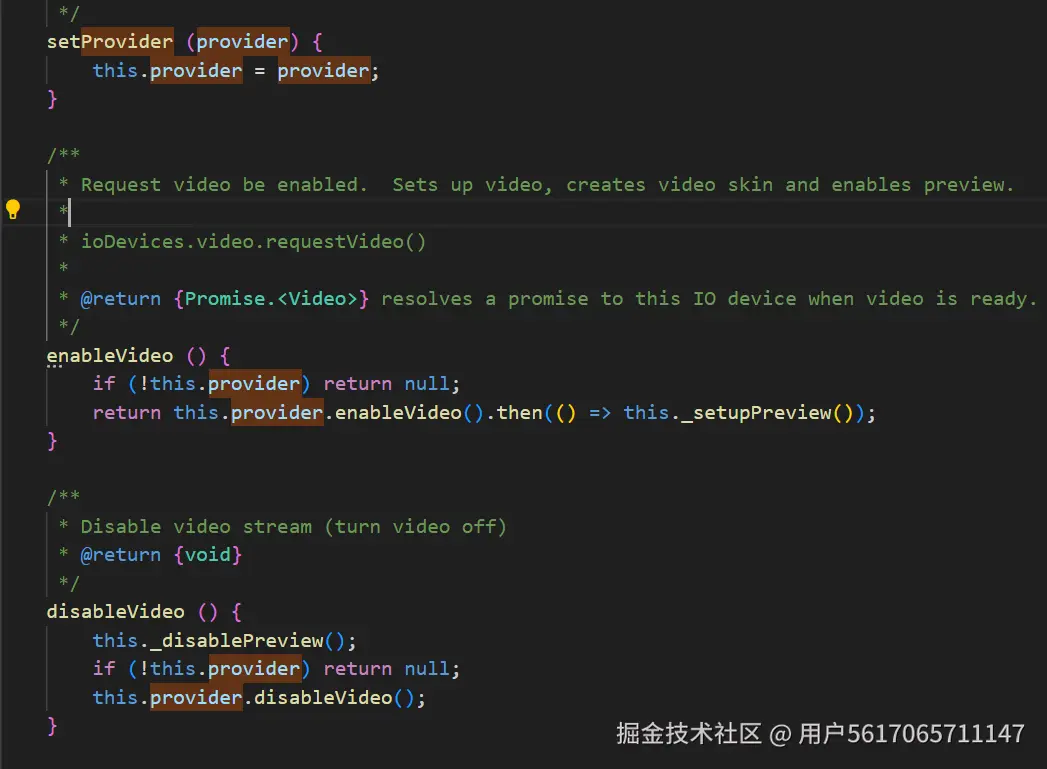 这里就很清晰了,把new出来的VideoProvider的对象设置到了原来那个video.js中的this.provider中,也就是默认的开启电脑摄像头的功能就是调用的VideoProvider里面的enableVideo方法,还是老办法,ctrl+点击进入VideoProvider类里面