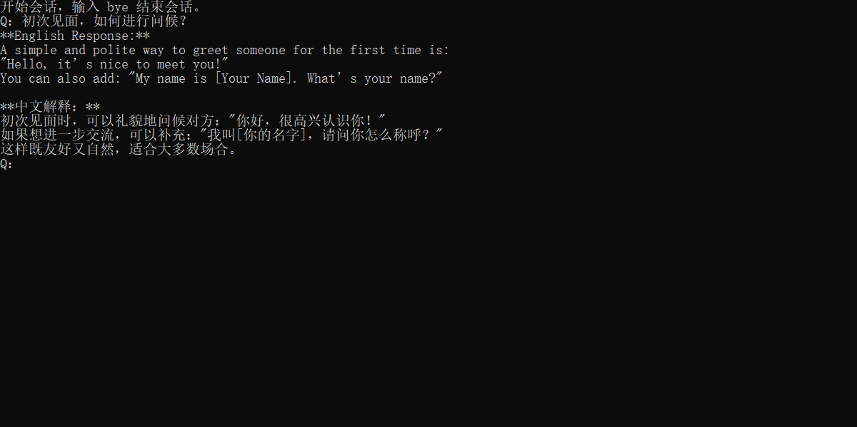 Console.WriteLine("开始会话,输入 bye 结束会话。");