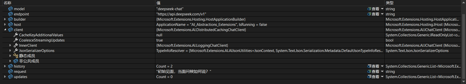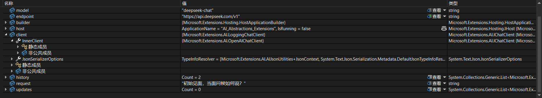 断点时局部变量(由于使用了日志,所以对象是AILogingChatClient)。