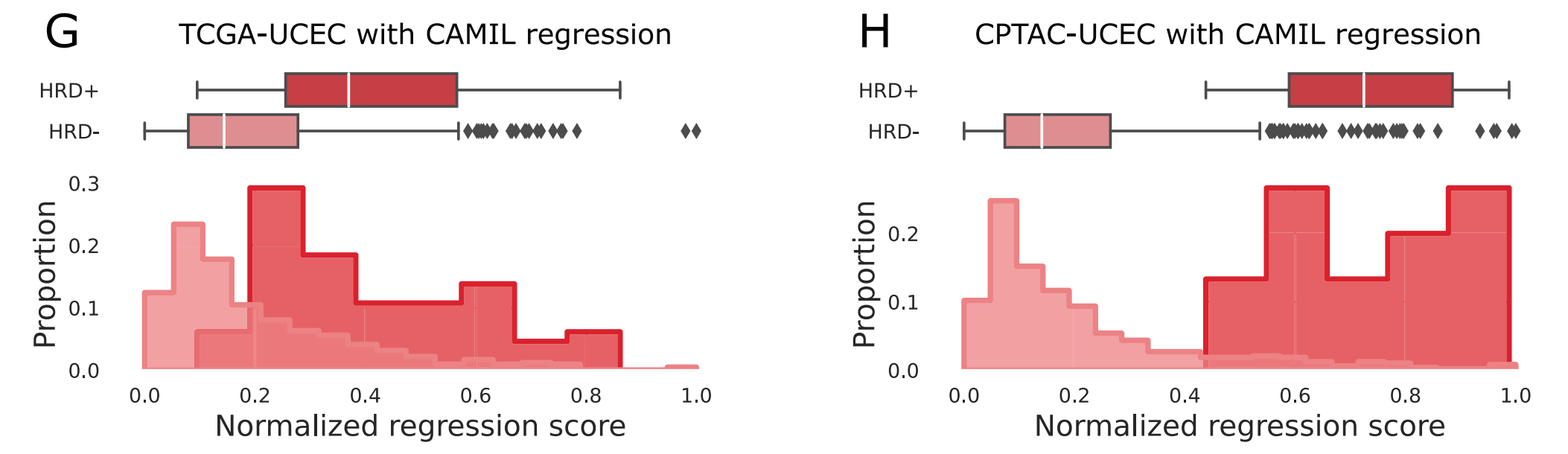 在子宫内膜癌(UCEC)中,CAMIL回归的AUROC(衡量区分能力的指标,越接近1越好)达到0.96,比传统分类模型的0.98虽略低,但关键是------CAMIL回归能把HRD阳性和阴性患者的预测分数分得更开(见图2G、H)。