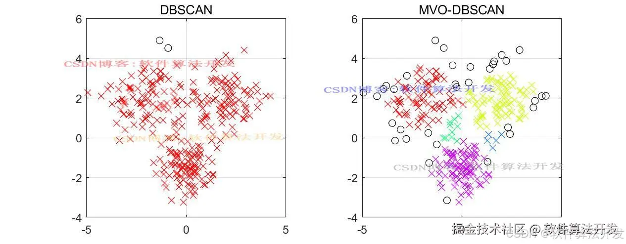 1.程序功能描述 基于MVO多元宇宙优化的DBSCAN聚类算法matlab仿真,对比单独的DBSCAN聚类和通过MVO优化后的DBSCAN聚类算法的聚类效果。