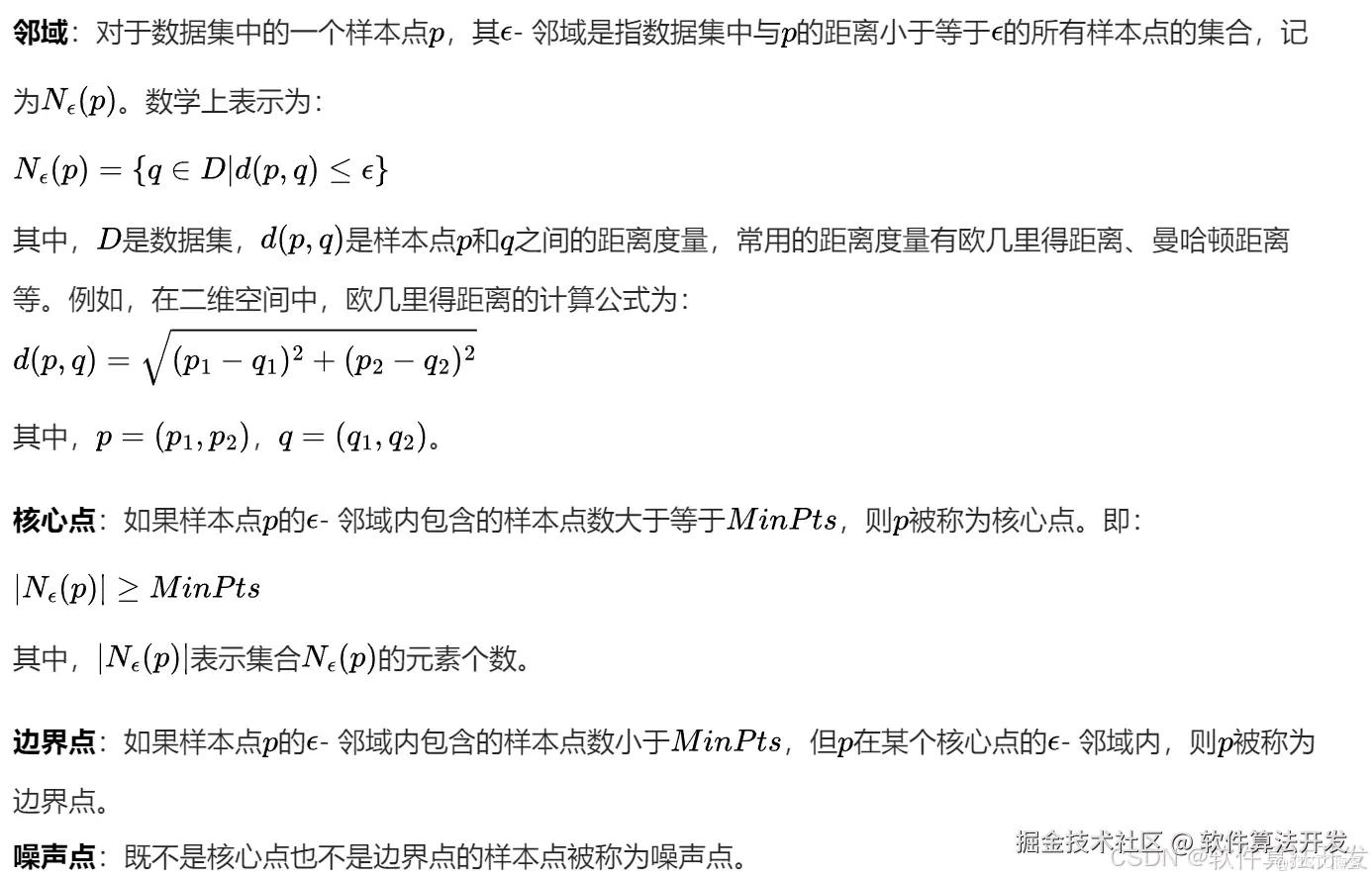 4.本算法原理 聚类分析是数据挖掘和机器学习中的重要任务,旨在将数据集中的样本划分为不同的组或簇,使得同一簇内的样本具有较高的相似性,而不同簇之间的样本具有较大的差异性。DBSCAN(Density - Based Spatial Clustering of Applications with Noise)算法作为一种经典的基于密度的聚类算法,在处理具有复杂形状的数据集和发现噪声点方面表现出色。然而,DBSCAN 算法的性能高度依赖于两个关键参数:邻域半径和最小点数。不合适的参数设置可能导致聚类结果不理想,如簇的划分不准确、噪声点误判等。
