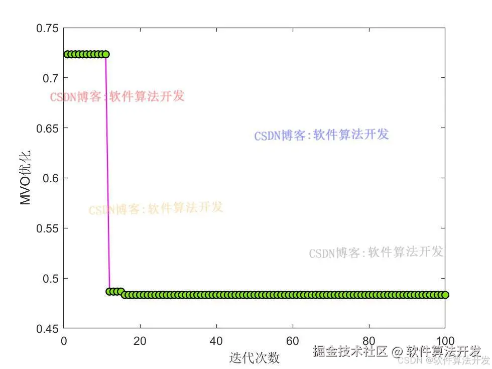 % 创建一个新的图形窗口 figure; % 绘制多宇宙优化算法的收敛曲线 plot(ysave,'-mo',... 'LineWidth',1,... 'MarkerSize',6,... 'MarkerEdgeColor','k',... 'MarkerFaceColor',[0.5,0.9,0.0]); % 设置x轴标签 xlabel('迭代次数'); % 设置y轴标签 ylabel('MVO优化'); `