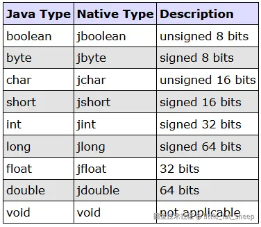 JNI 提供以下 9 种基本数据类型。官方介绍详见 → primitive-types。