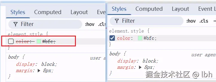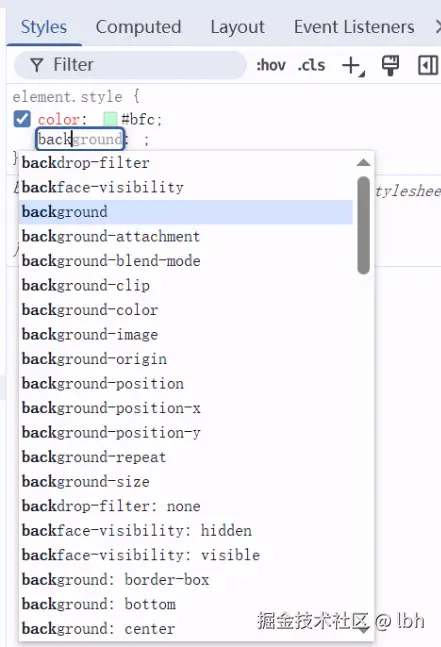 当你在 Elements 面板 的 Styles 标签页 中查看某个元素的 CSS 样式时,你会看到应用到该元素上的所有 CSS 规则。