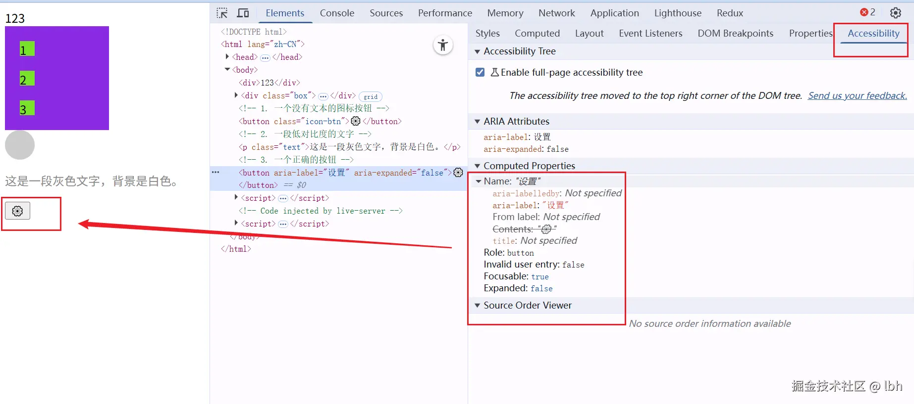 作用 :评估当前元素的无障碍 (Accessibility, a11y) 特性,确保残障用户(如视障人士使用屏幕阅读器)也能正常使用你的网站。个人认为啊,它不是可有可无的"加分项",而是现代 Web 开发的基本要求。