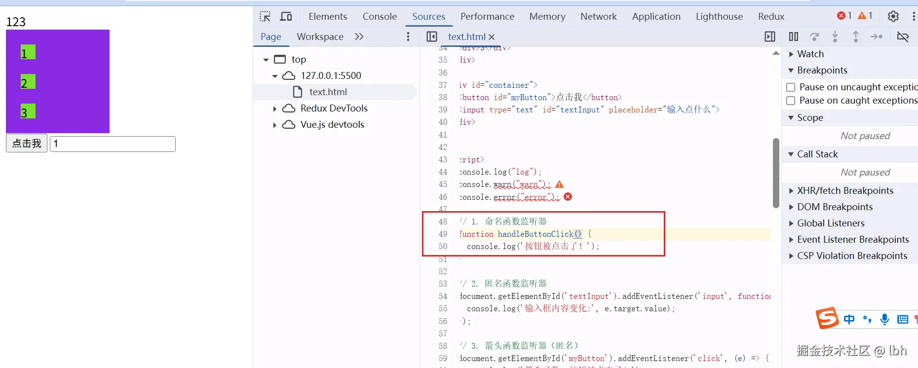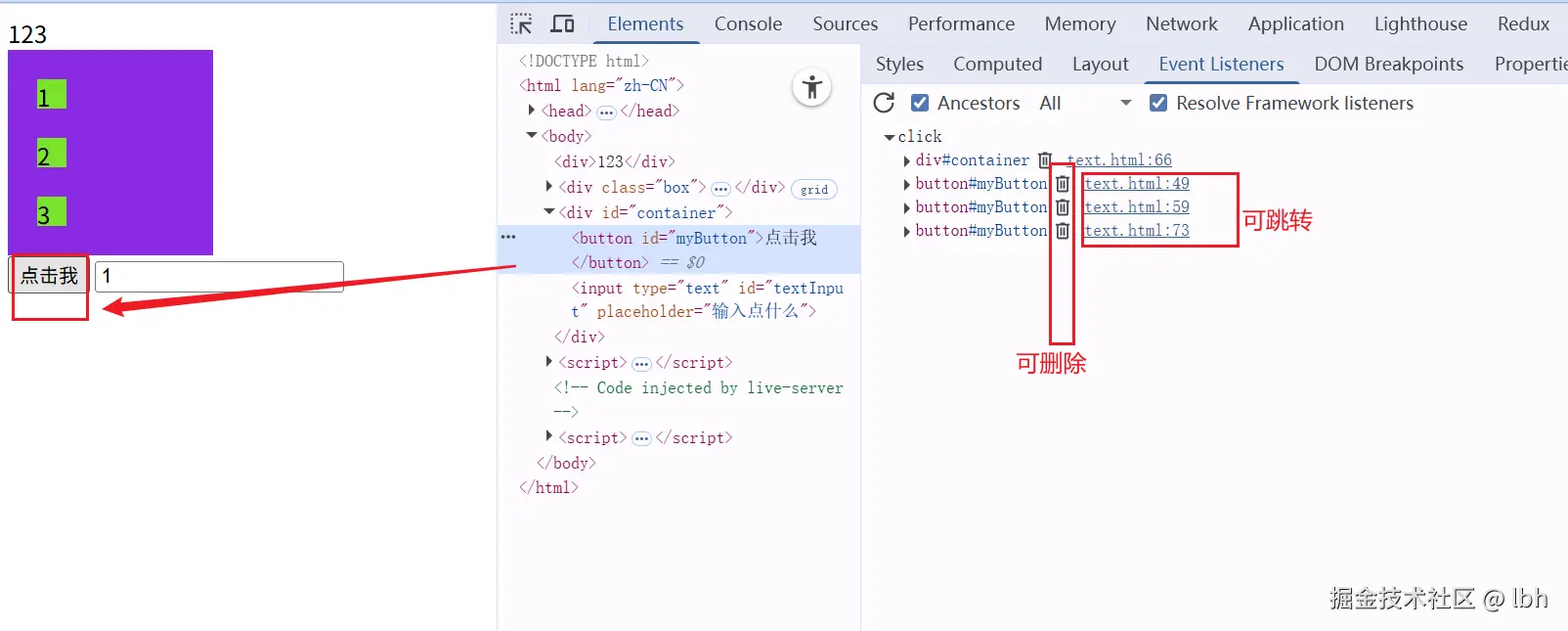 - Event Listeners 标签页:列出绑定到该元素的所有事件监听器(包括捕获和冒泡阶段)。