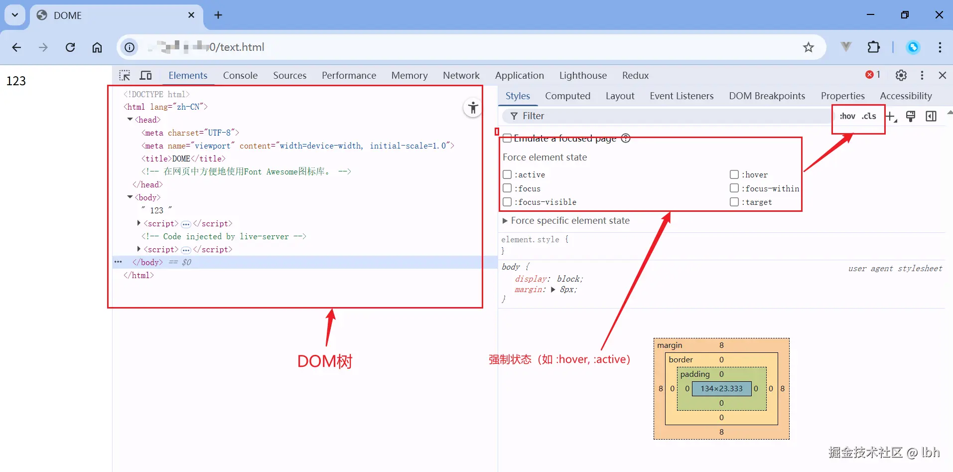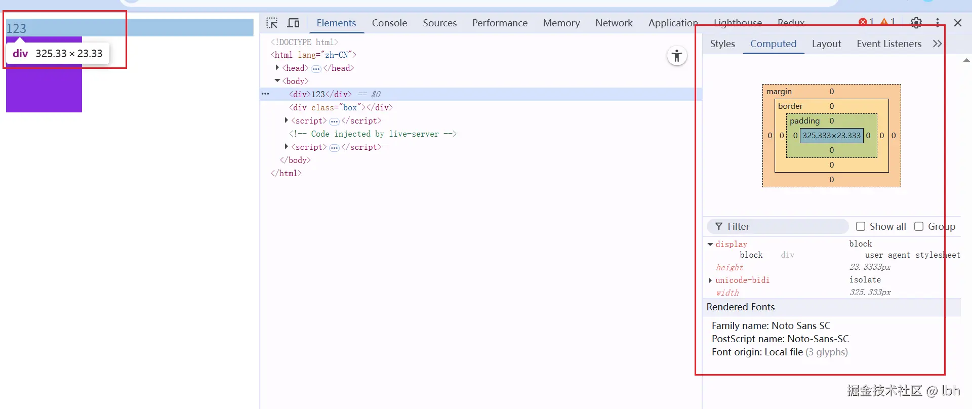 查看最终计算出的 CSS 值 查看真实尺寸、盒模型、继承值 。