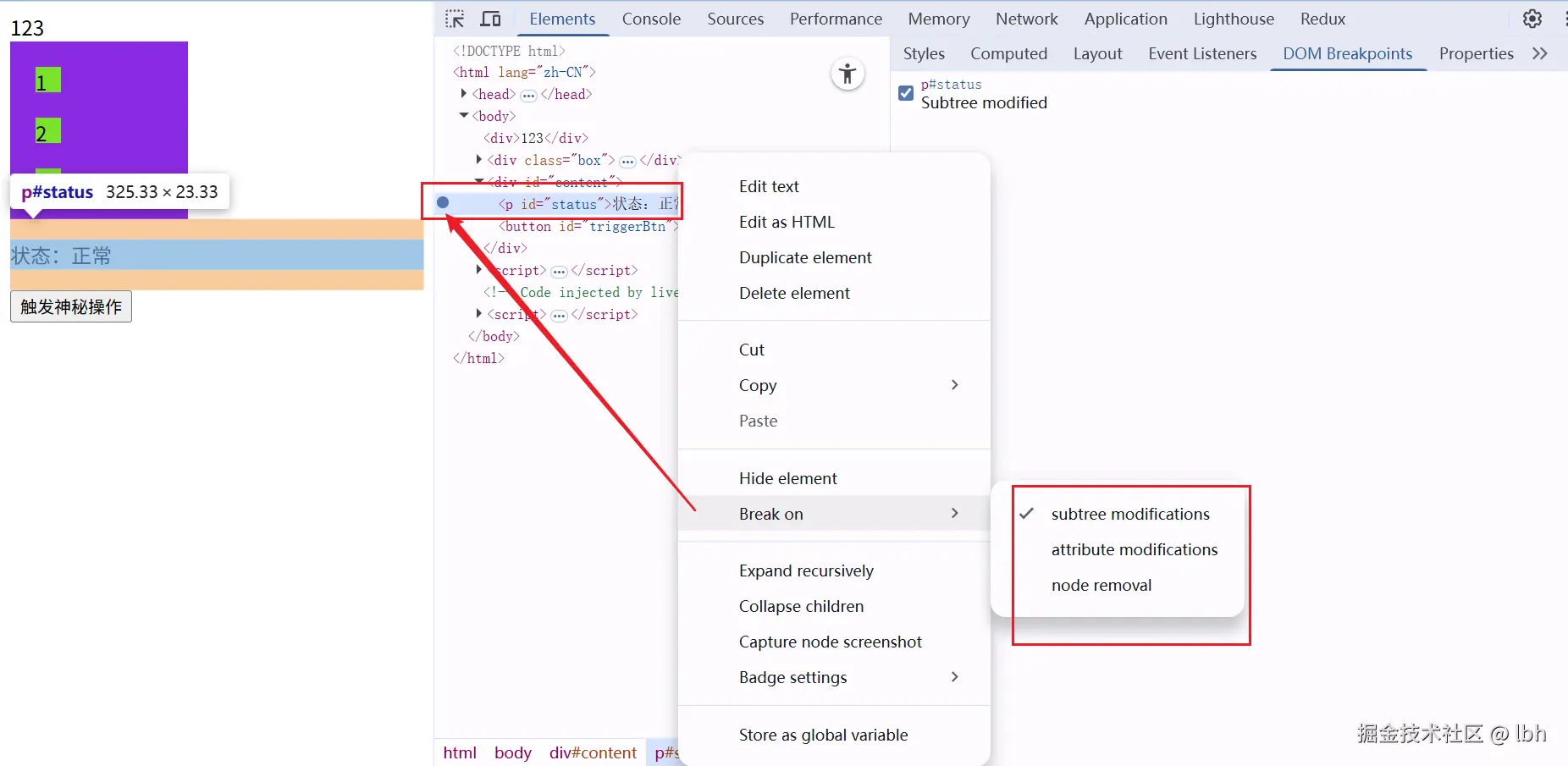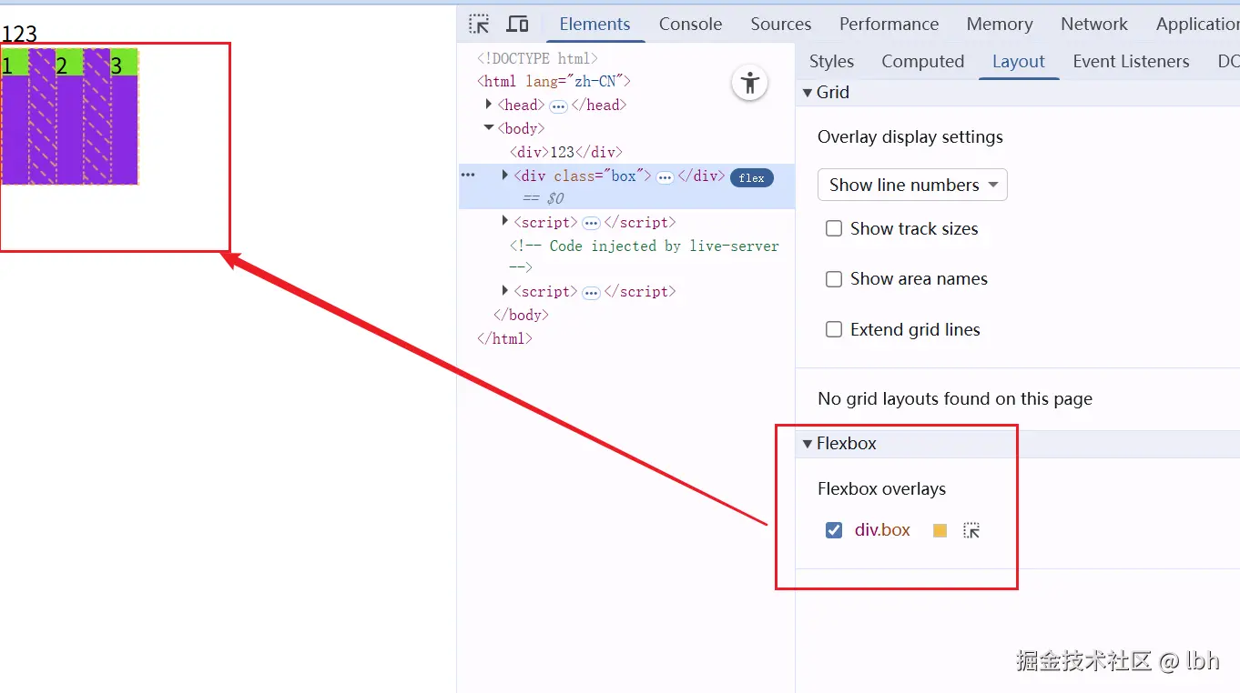 - 使用元素选择器(或点击 Elements 面板)选中第一个