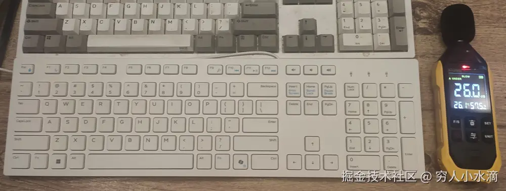 相比之前 (38dB), 新的静音键盘 (KB216) 在噪声方面有显著改善. 希望老公晚上能睡好了 (狗头).