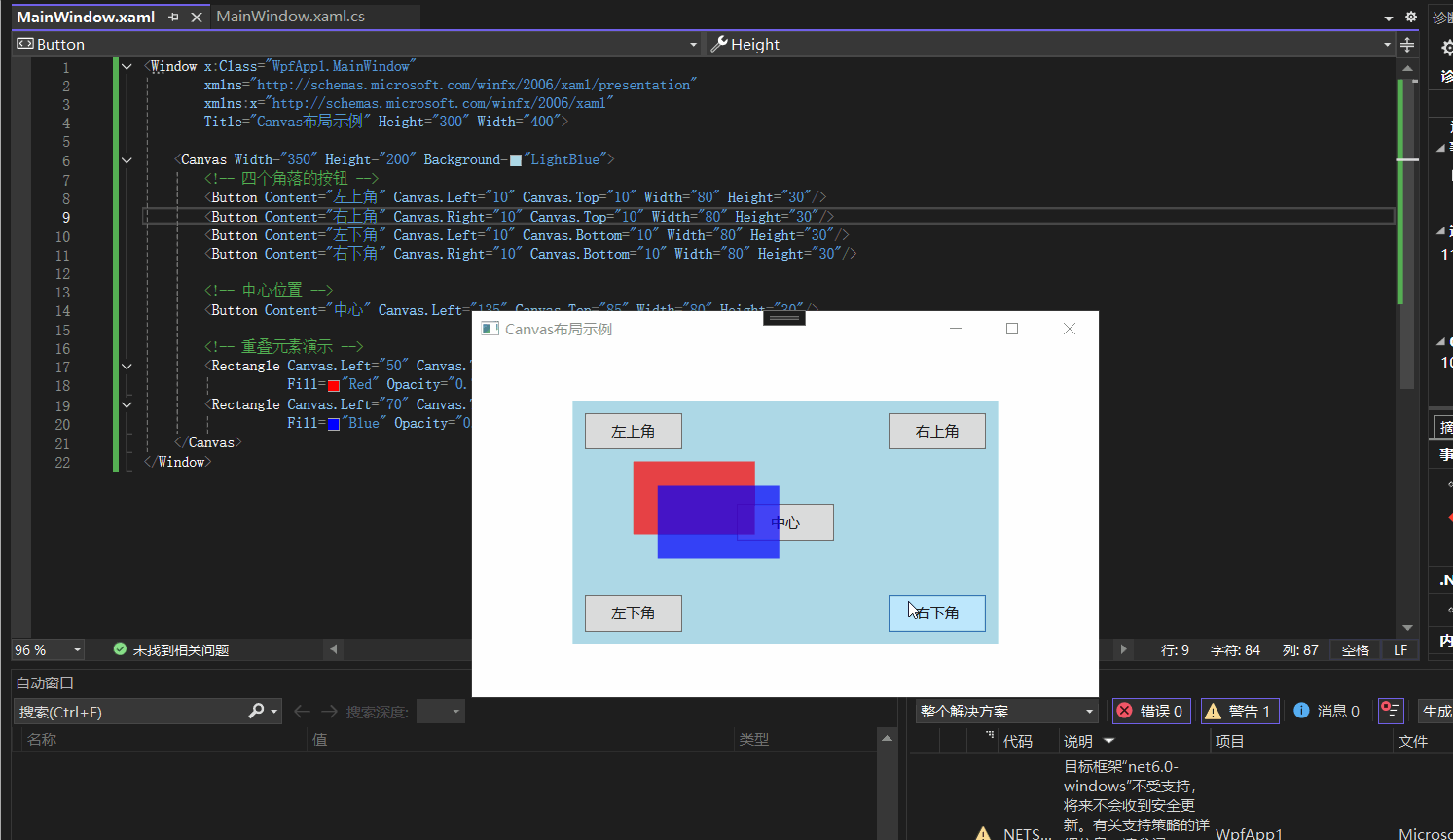 <Button Content="左上角" Canvas.Left="10" Canvas.Top="10" Width="80" Height="30"/>