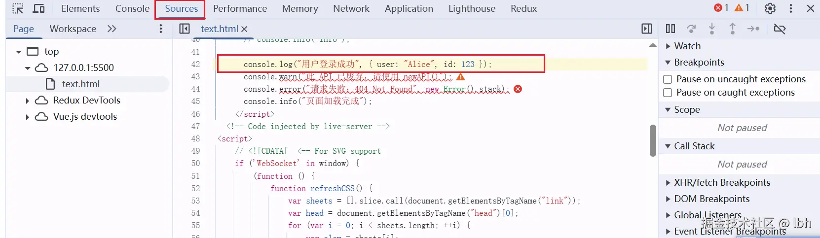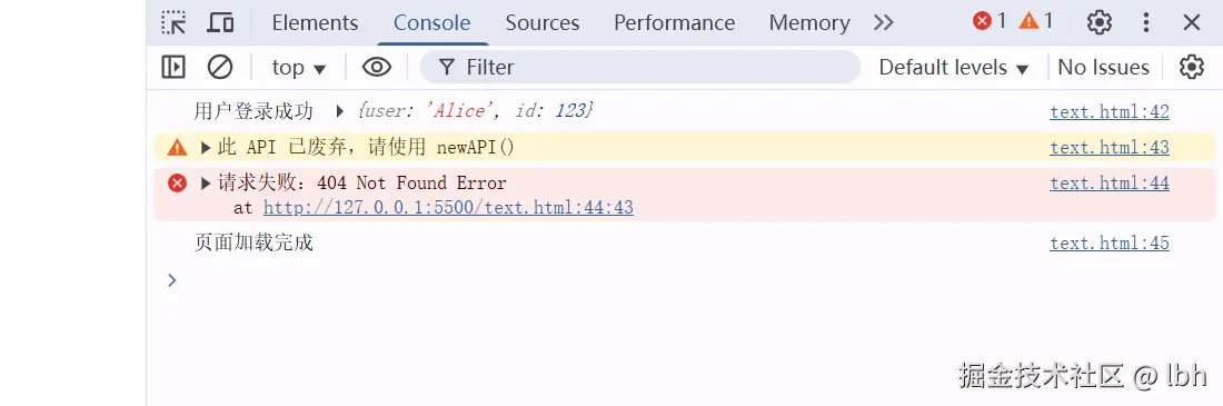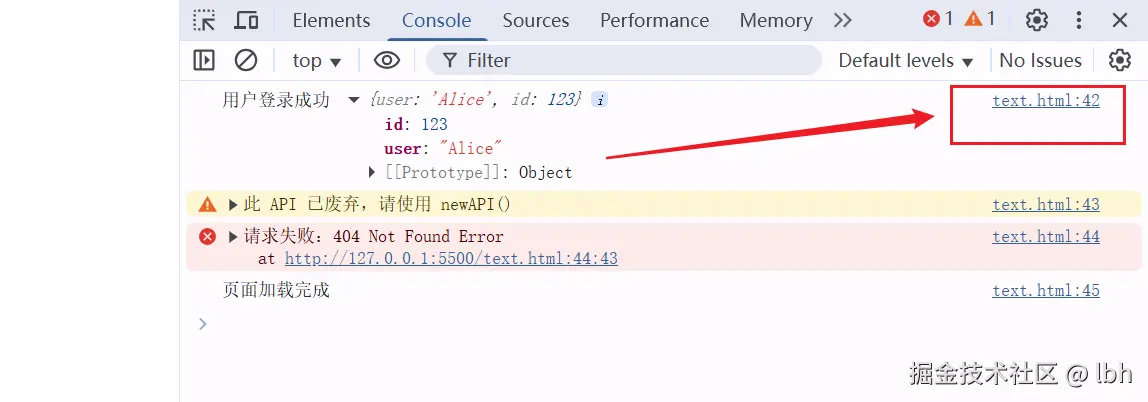 附带调用栈,点击文件名跳转到 Sources 面板