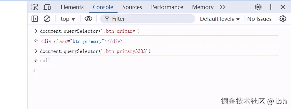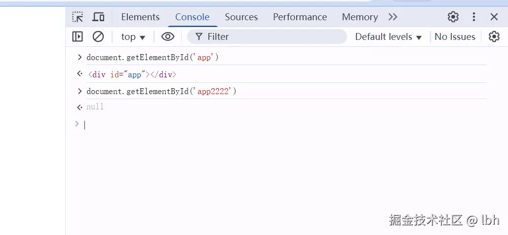 的 DOM 元素对象(如果存在)。如果元素存在,控制台会显示该元素的 HTML 片段(如<div id="app">...</div>