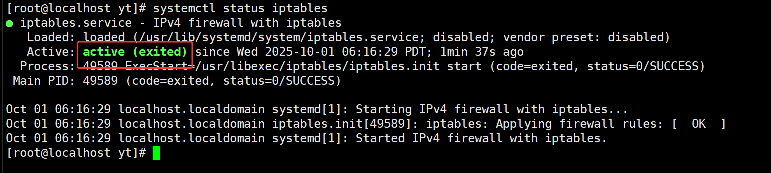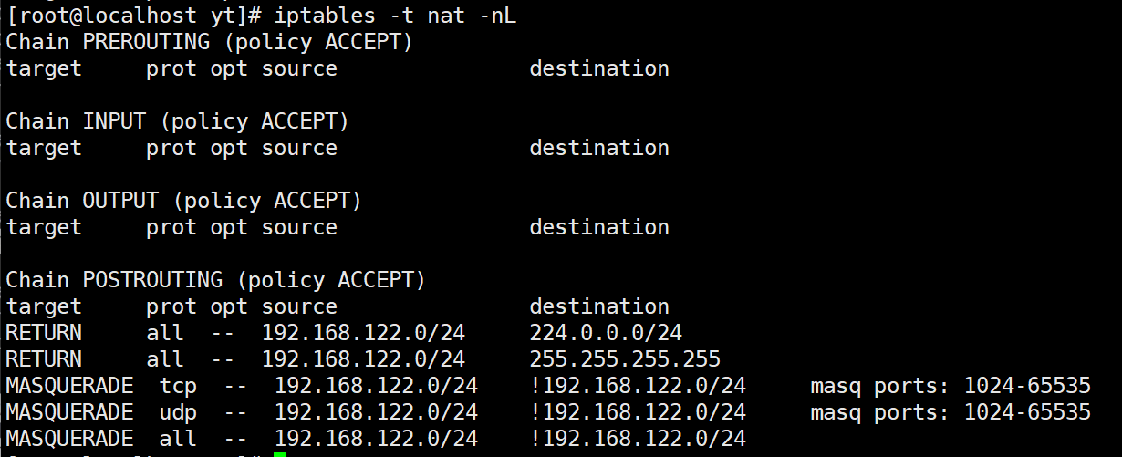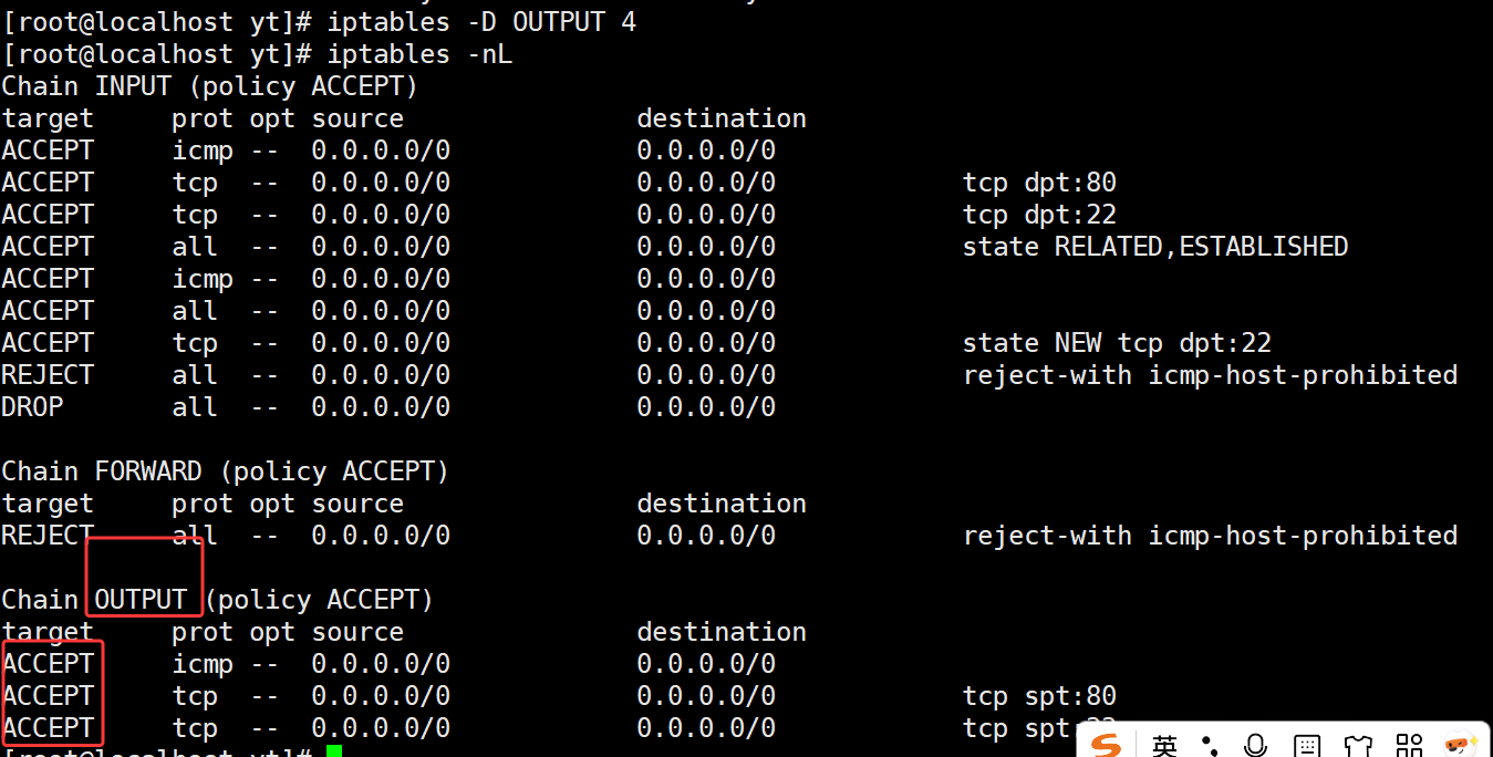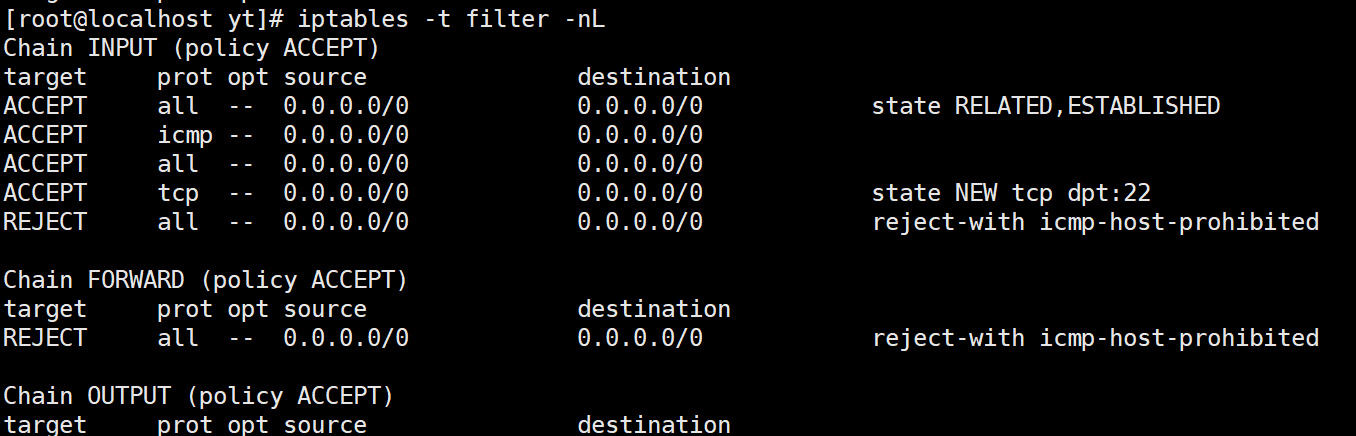 [root@localhost yt]# iptables -I OUTPUT -j DROP