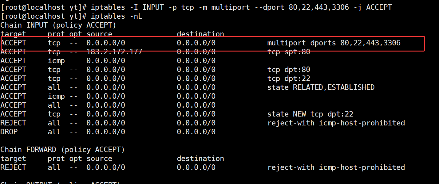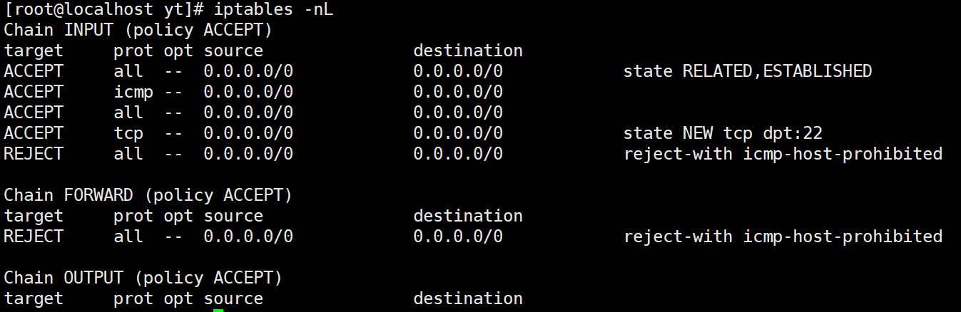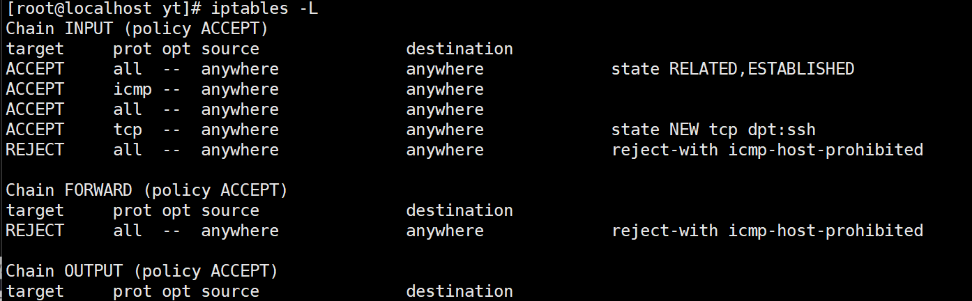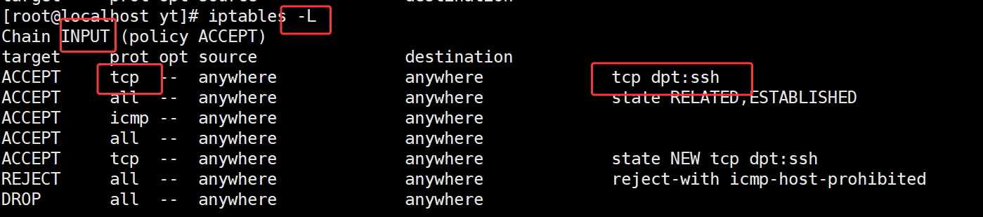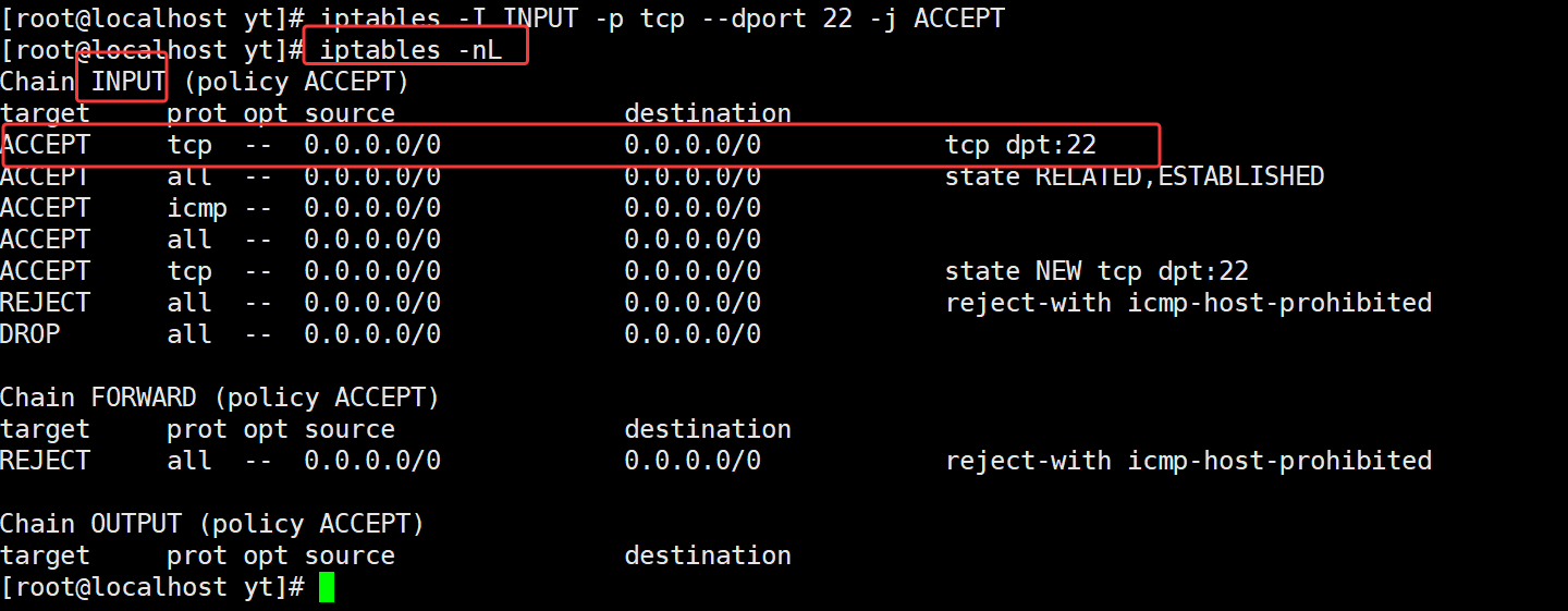 [root@localhost yt]# iptables -I INPUT -p tcp --dport 22 -j ACCEPT