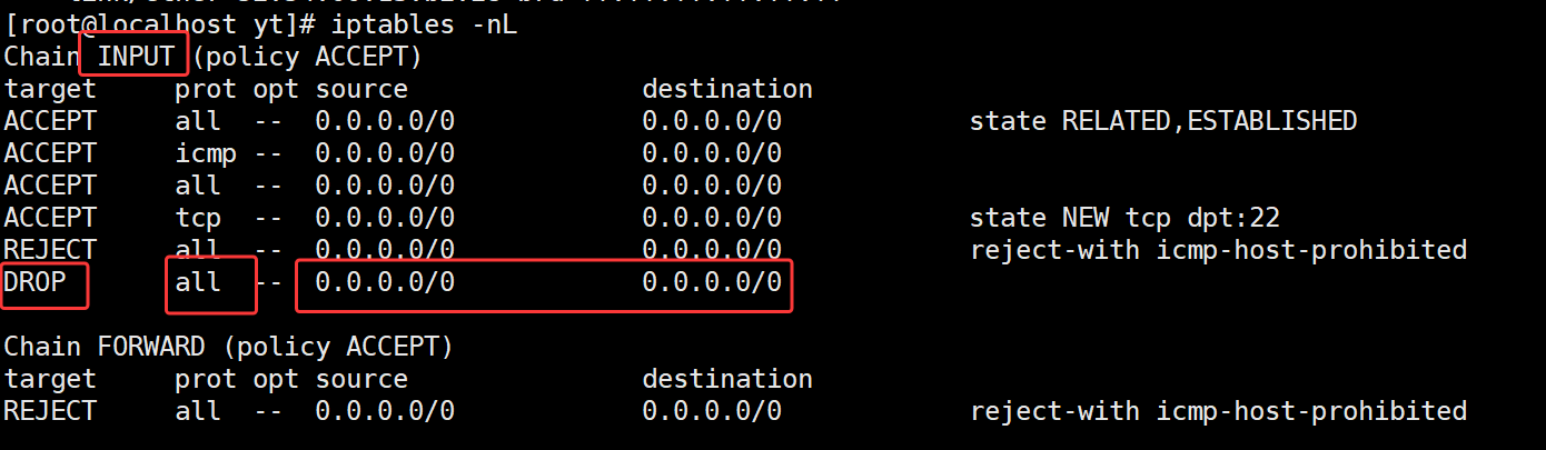 [root@localhost yt]# iptables -A INPUT -j DROP