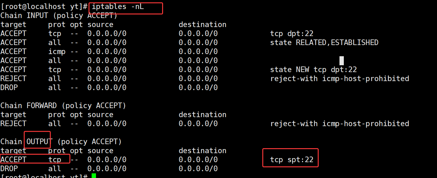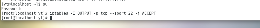[root@localhost yt]# iptables -I OUTPUT -p tcp --sport 22 -j ACCEPT