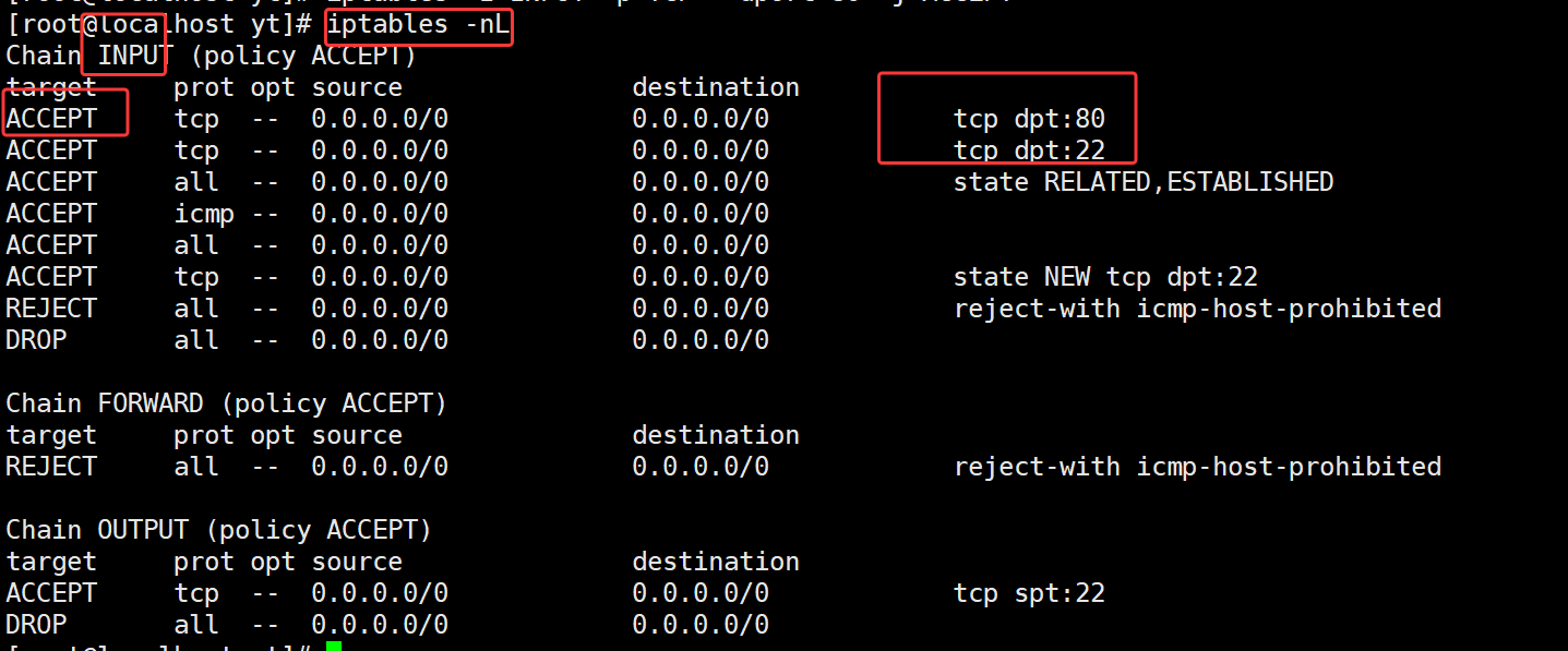 [root@localhost yt]# iptables -I INPUT -p TCP --dport 80 -j ACCEPT