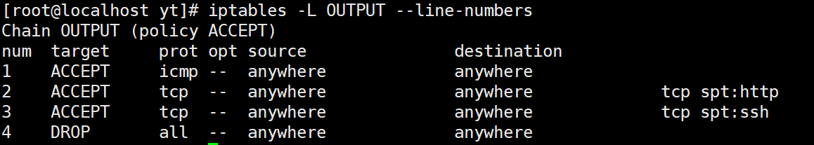 [root@localhost yt]# iptables -L OUTPUT --line-numbers