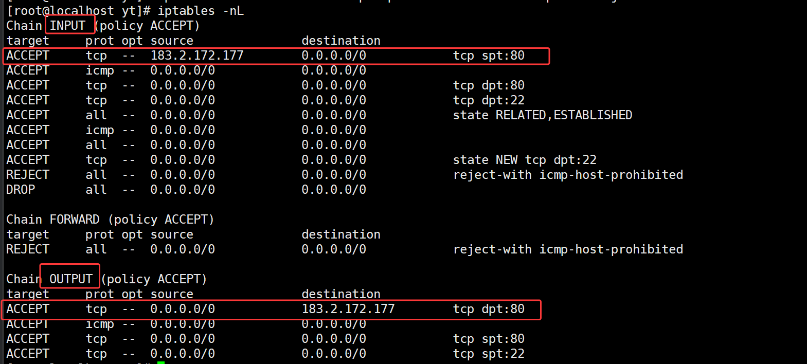 [root@localhost yt]# iptables -I OUTPUT -o ens33 -p tcp -d 183.2.172.177 --dport 80 -j ACCEPT
